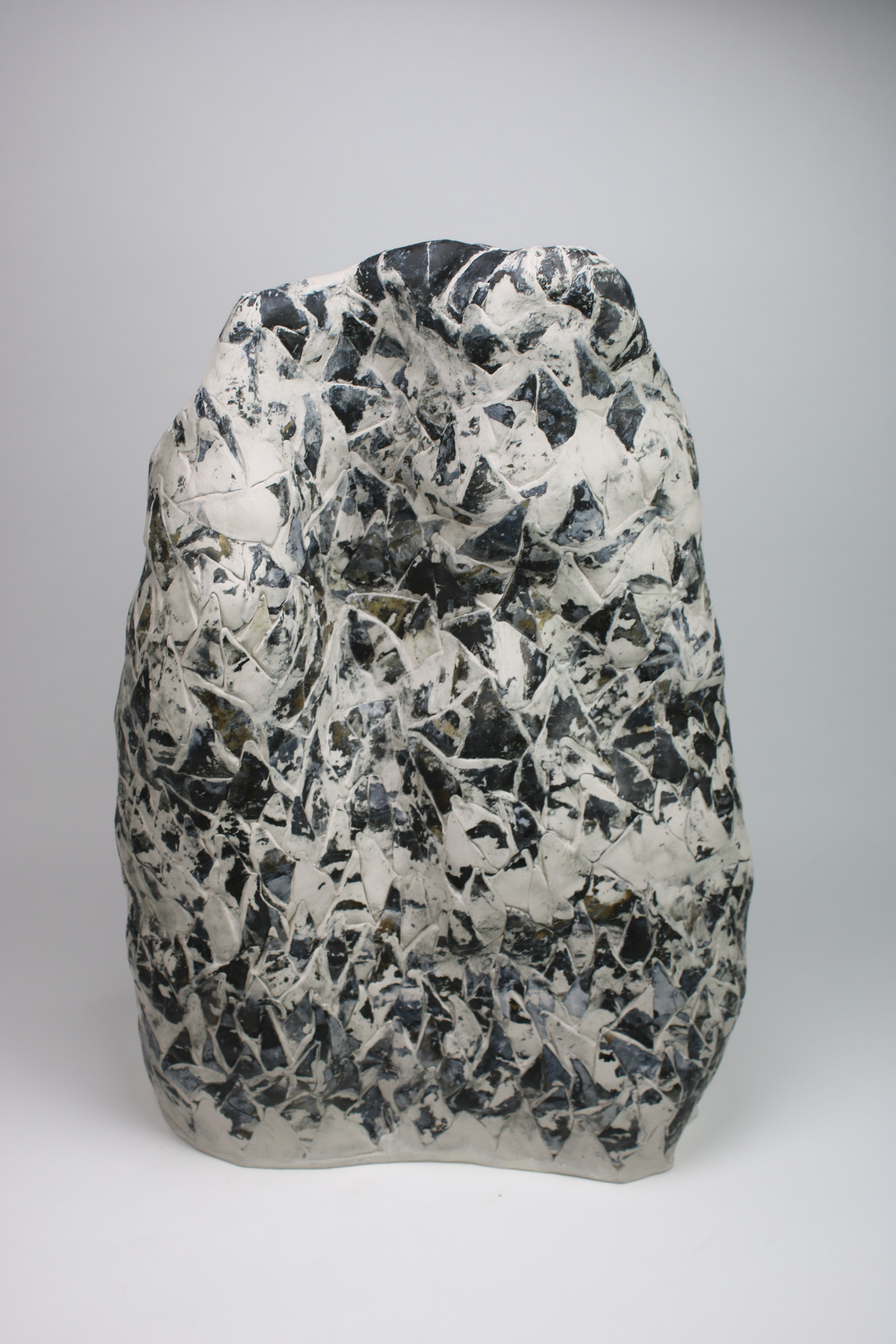 I work primarily with slabs of clay, especially porcelain for its haptic qualities, to create unusual ceramic surfaces with abstract geometric patterns and sometimes human motifs that emerge in my work. Details, stripes, dots or a grid that carry me into a universe full of stories, memories and possible projections. I try to bring viewers strong and chaotic emotions, a universe of suggested thoughts.