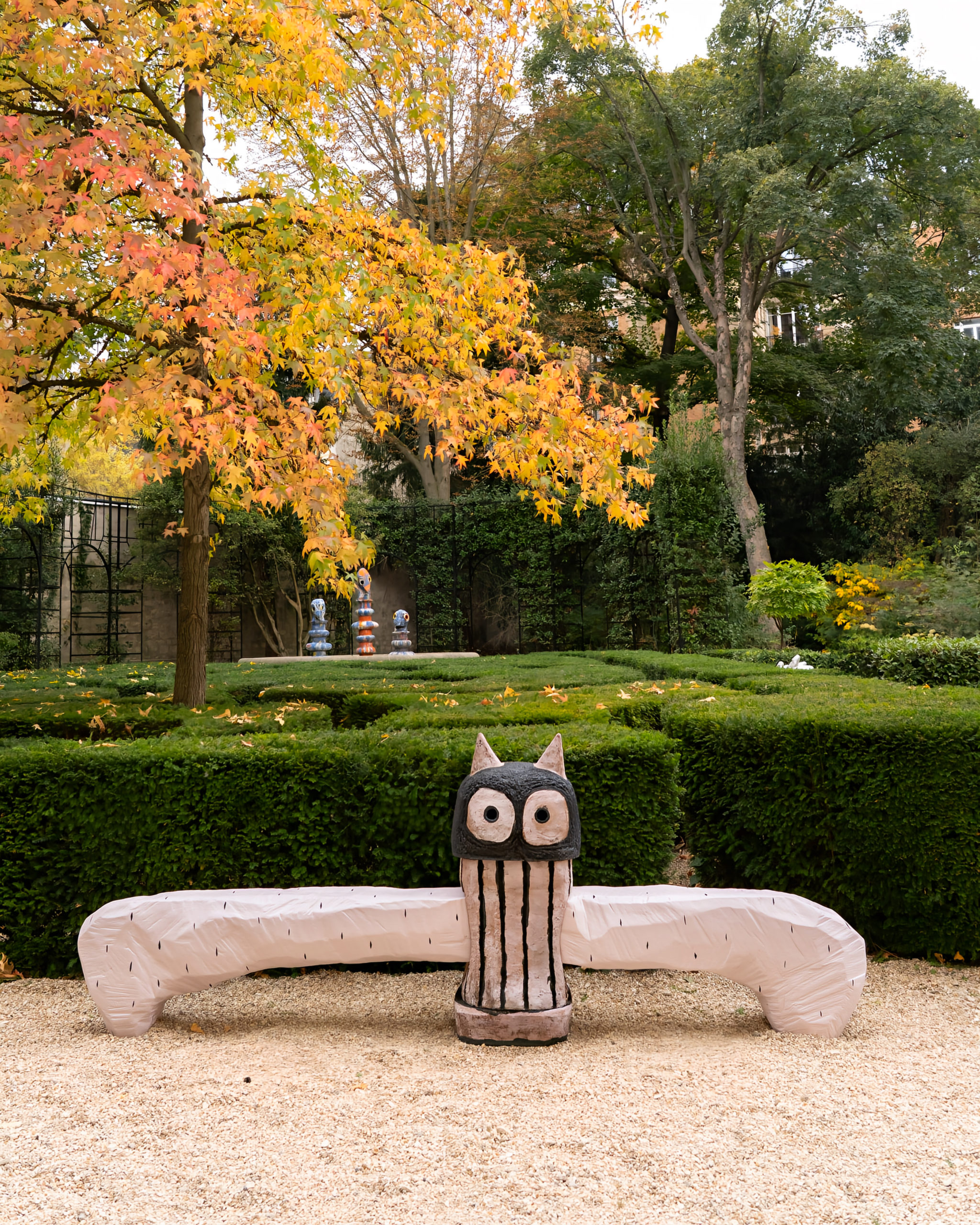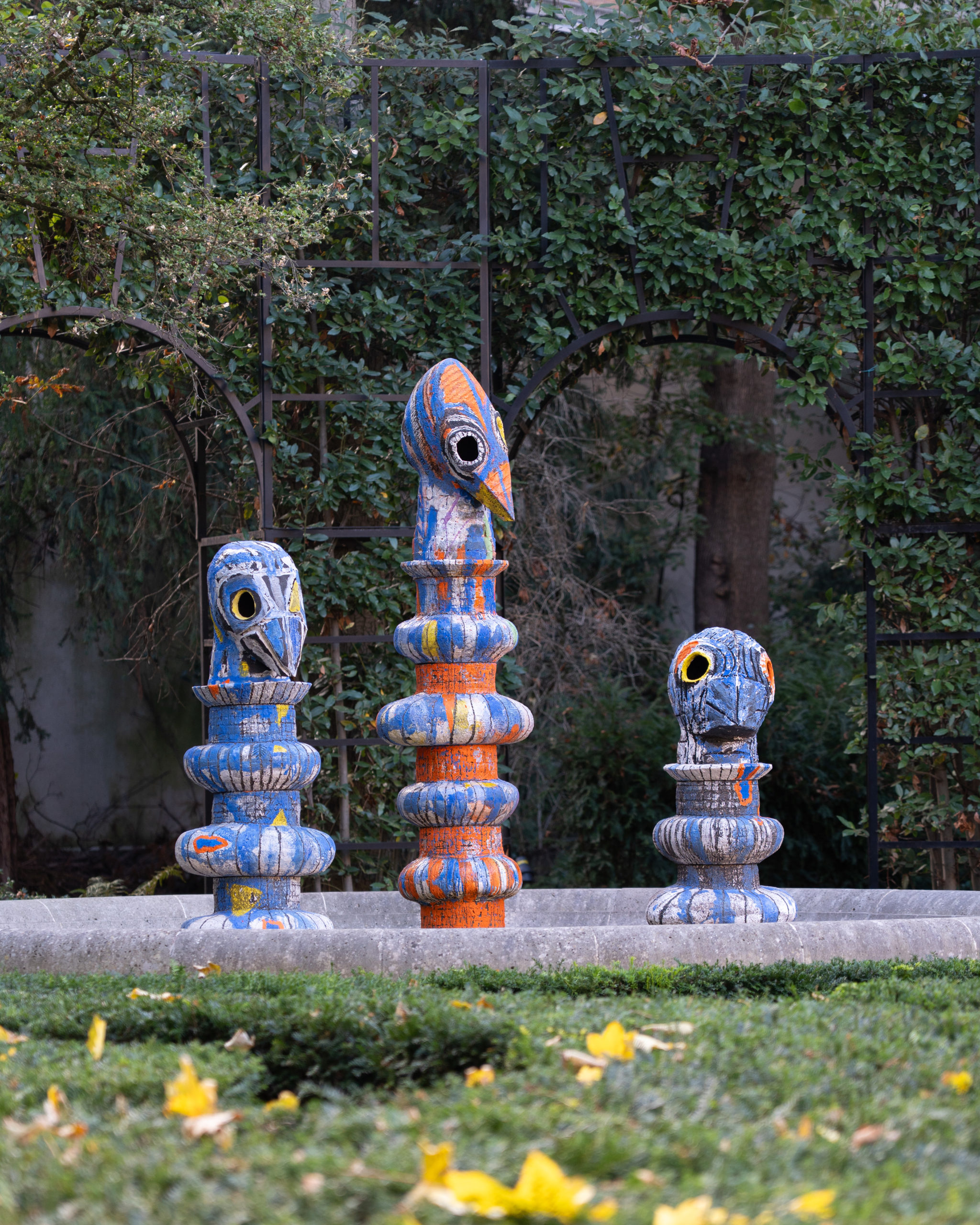 Small and tall fantastic monsters, colorful beings, mischievous and strange, whose textures look similar to papier-mâché dolls. Owls, bats, cats, imps and chimeras and many more mysterious animals make up Timothée Humbert’s saturated and streaked colored carnival.